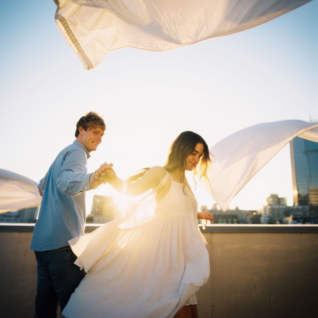 Image Prompt: A joyful couple dances hand-in-hand on a rooftop at golden hour, captured in a warm, cinematic, soft-focus style with flowing fabric adding a dreamy, romantic feel.