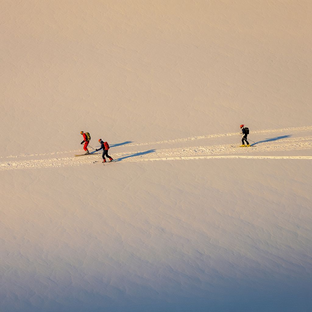 Image Prompt: Three people skiing across a vast, sunlit snowfield, captured in a minimalist, high-contrast style that emphasizes scale and isolation.