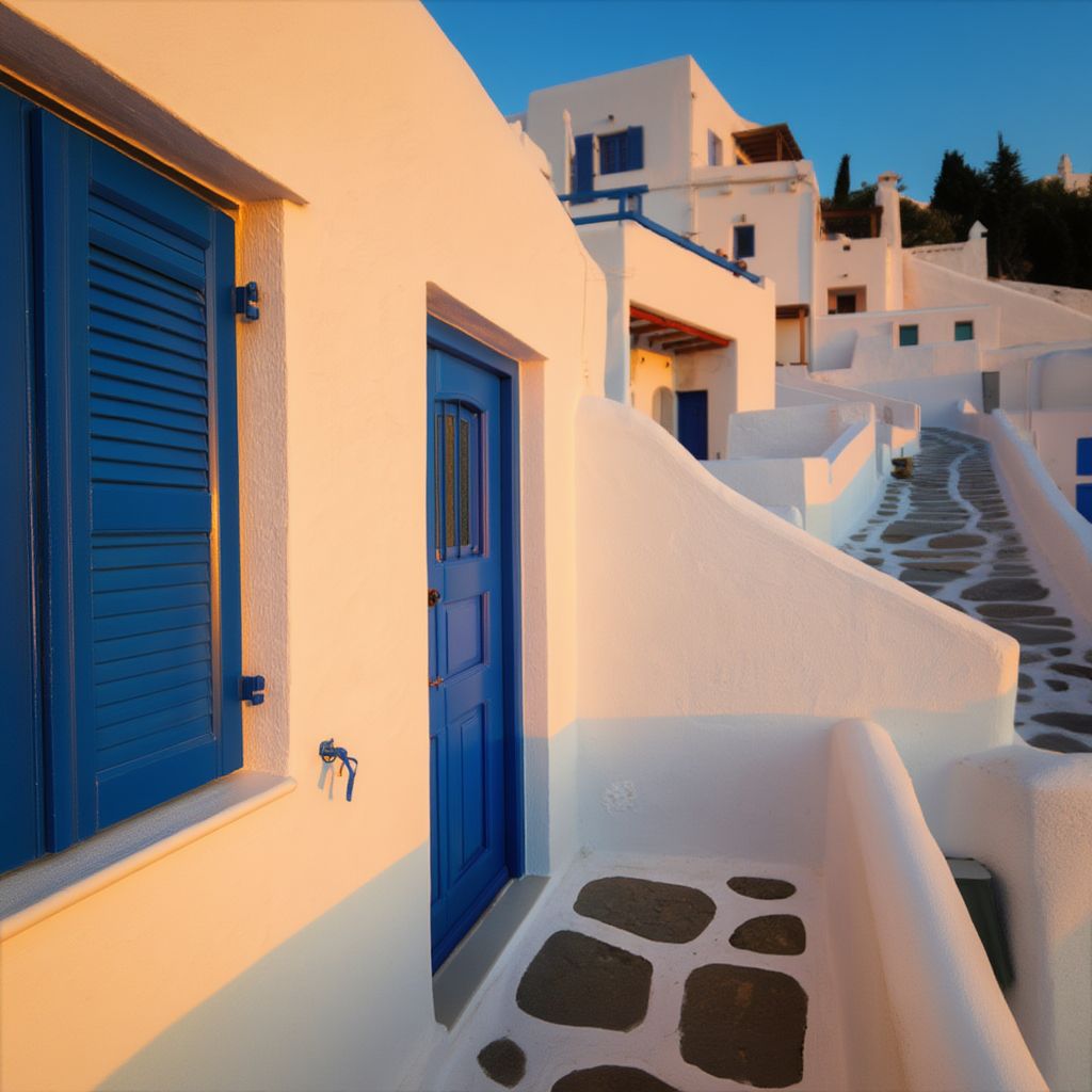 Image Prompt: A sunlit photograph of traditional Greek Cycladic architecture, featuring whitewashed buildings with blue doors and windows along a narrow, stone-paved pathway.
