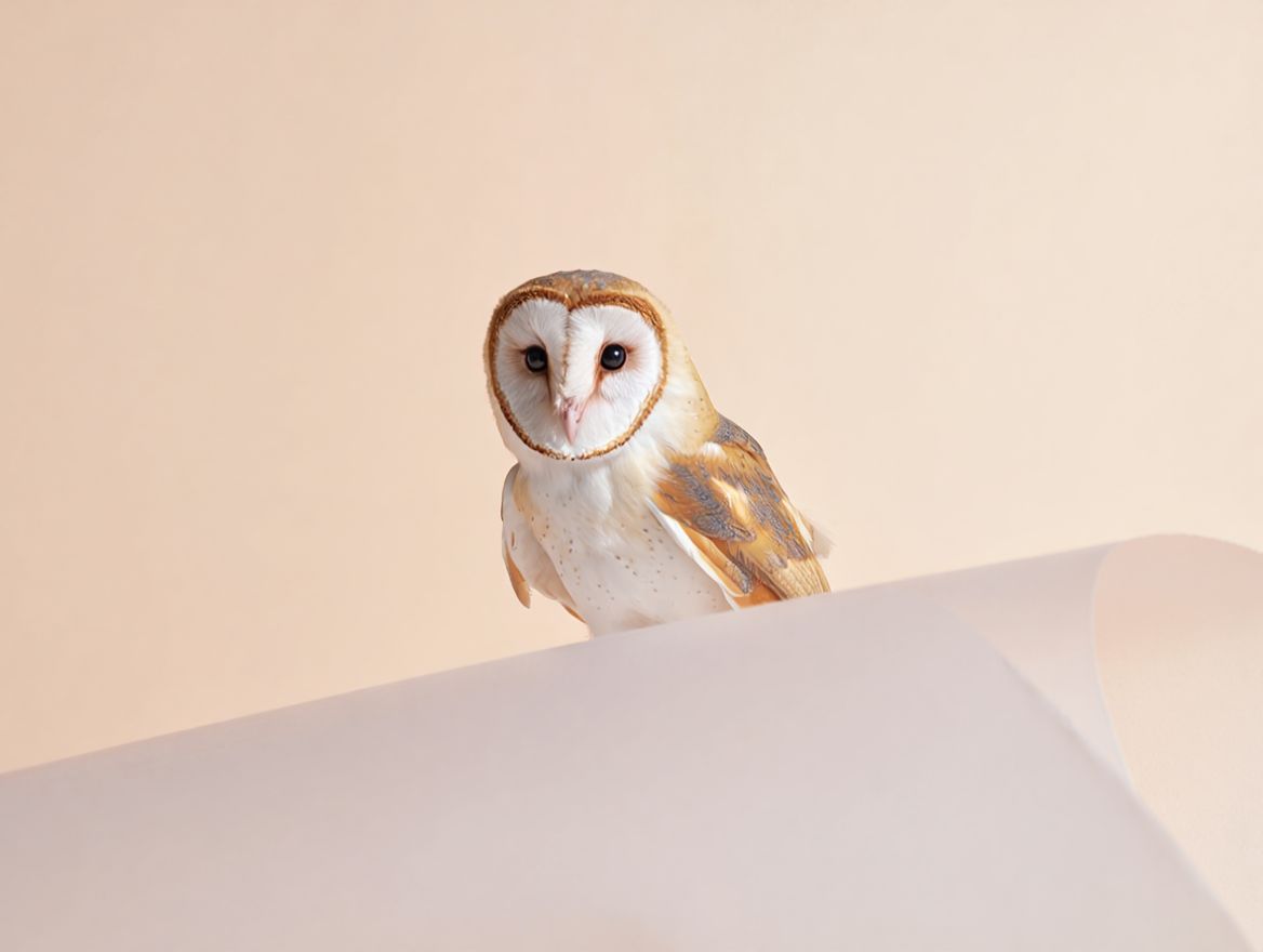 Image Prompt: A barn owl perched gracefully on a simple stand, set against a smooth beige backdrop. The composition is minimalistic and studio-style, with soft, warm natural lighting highlighting the owlās feathers and casting gentle shadows for a serene, elegant look.