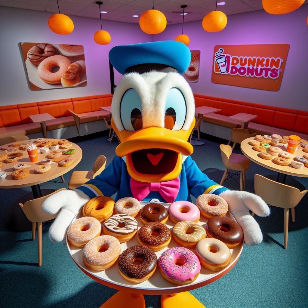 DALL-E 3 Prompt: Donald Duck on a donut-tasting tour at the Dunkin Donuts headquarters, fun overhead food photography style, bright lighting