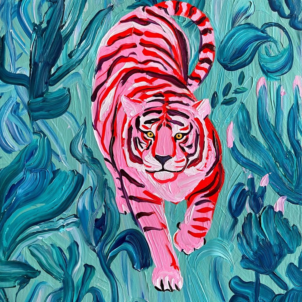 Image Prompt: A vibrant, impressionistic painting of a pink and red tiger striding through bold, textured teal foliage in an expressive, brushstroke-heavy style.